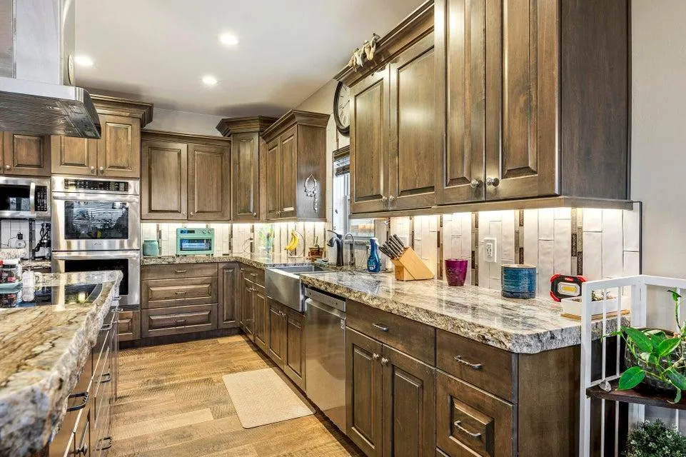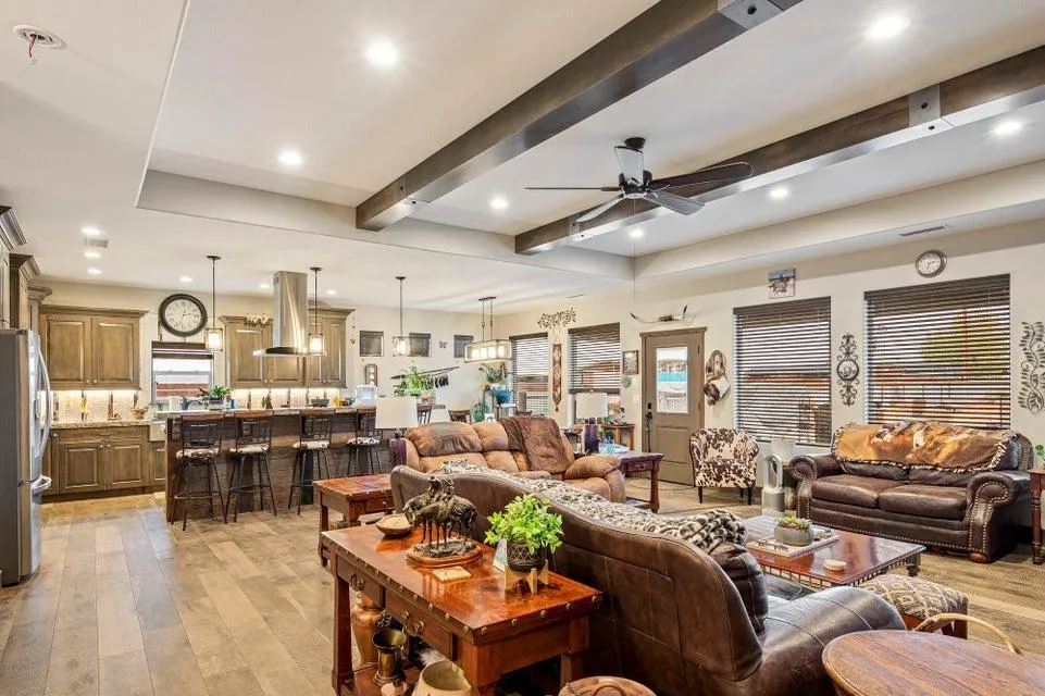 The backyard is fully enclosed with durable steel fencing, making it a safe spot for kids and pets to roam. There are built-in dog kennels and a dedicated ATV/UTV shed ready for your toys. On the east side, you’ve got RV parking with a full 50-amp hookup.